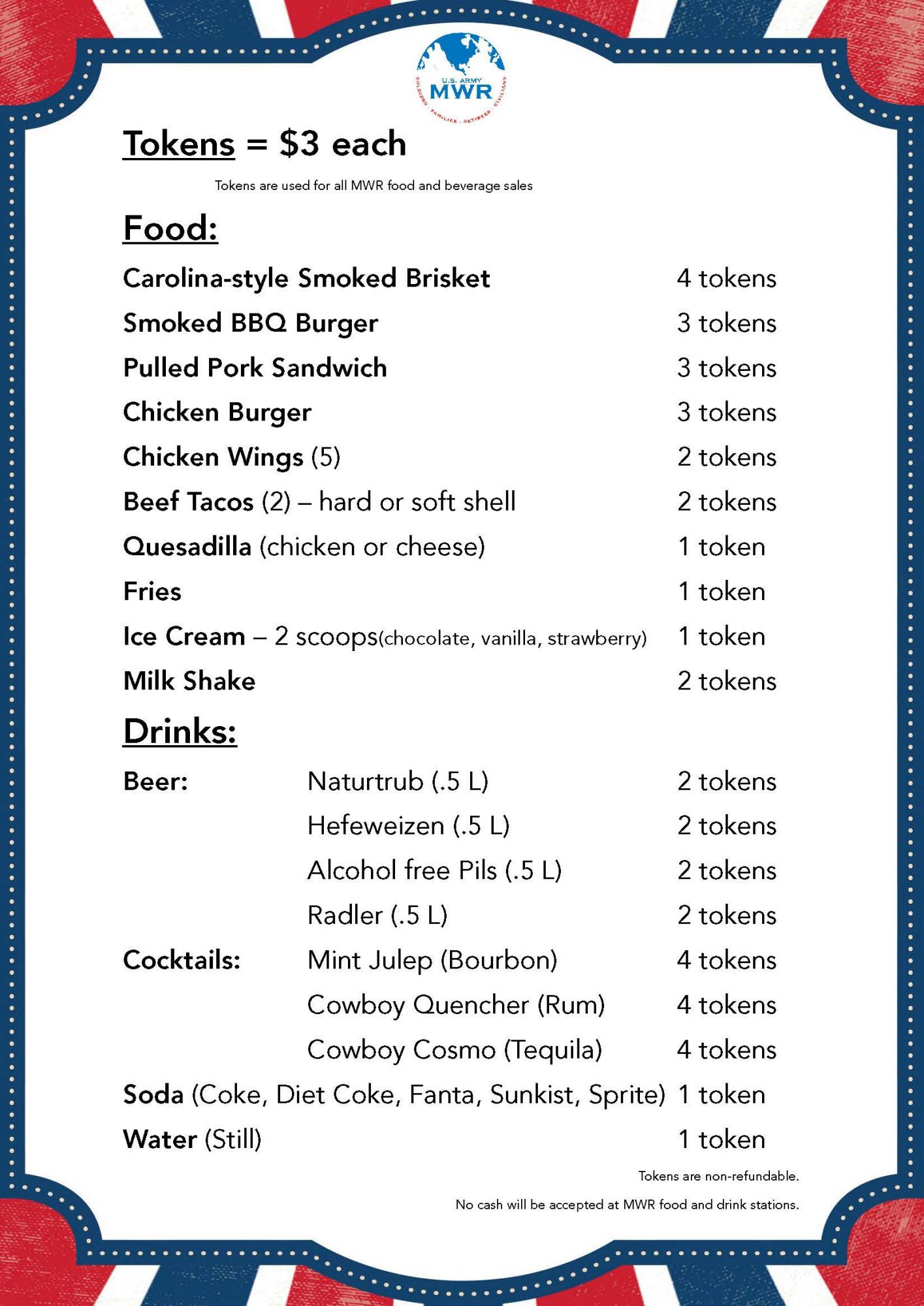 Tokens are non-refundable. No cash will be accepted at MWR food and drink stations. Other food and beverage vendors accept cash.
