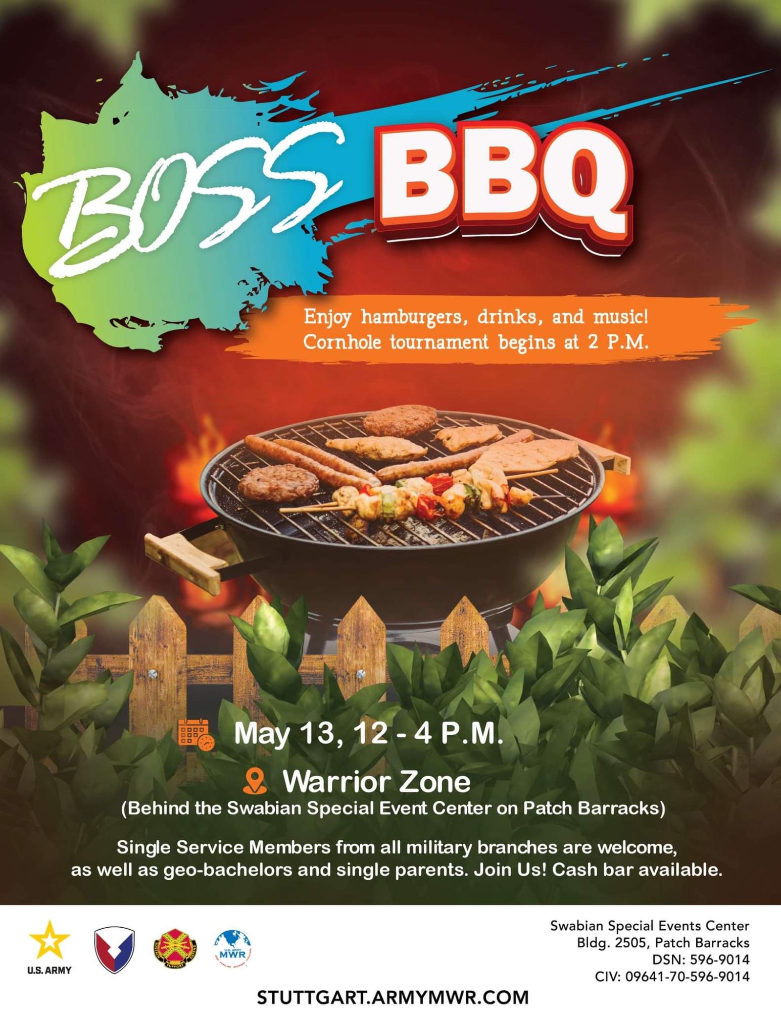 Get ready to enjoy a fantastic day at the USAG Stuttgart BOSS BBQ! Not only will you get to indulge in delicious hamburgers and drinks, but you'll also have the chance to groove to some great music with your friends.