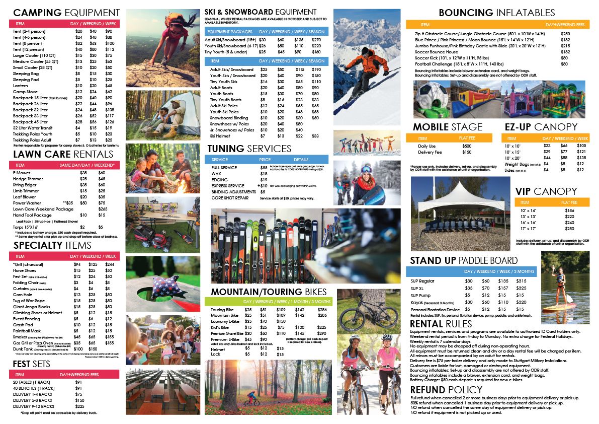 Summer rental equipment includes inflatables (bouncy houses), canopies, grills, games, bikes, tents, lantern, stoves, backpacks, coolers, sleeping bags, sleeping pads, chairs, fest tables and benches. Winter equipment includes ski equipment (skis, boots, poles, helmets), snowboard equipment (boards, boots, & helmets), and snowshoes.